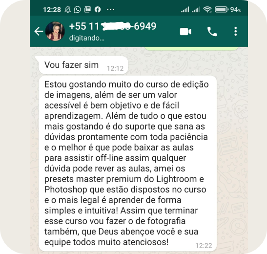 “Achava impossível editar fotos com qualidade profissional. Depois das aulas, meus clientes começaram a elogiar o resultado.” 📸